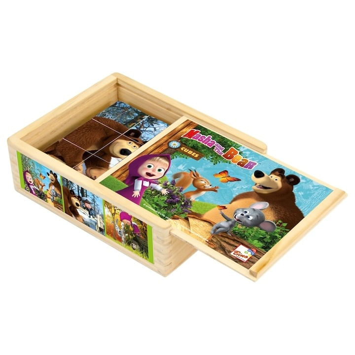 Prima jucarie pentru copilul tau: cele 12 cuburi de tablouri din lemn sunt prima jucarie perfecta cu sase motive colorate din cunoscuta serie pentru copii Masha si Ursul.DISTRACTIE DE ÎNVATARE: Jocul cu cuburile de lemn nu este doar distractie nesfârsita, dar promoveaza si coordonarea ochi-mâna, abilitatile motorii fine si coordonarea culorilor.SIGURANTA PENTRU COPII TAI - Fiti în siguranta deoarece cuburile noastre de imagine au fost certificate de laboratoare de testare recunoscute international si îndeplinesc cerintele ghidurilor de siguranta ale UE.Continutul cutiei: Cub imagine Masha si Ursul din lemn, 12 zaruri, jucarie pentru copiidimensiuni: 16,3 x 5,1 x 13 cmLemnCuburi de lemn cu motivul popular al lui Masha si Ursul. Acestia sustin rabdarea, coordonarea, abilitatile motorii, dar si imaginatia copiilor. Cuburile au o poveste diferita pe fiecare parte. Asa ca povestesc despre o aventura diferita a lui Masha si a ursului de fiecare data. acestea sunt asezate intr-o cutie mica din lemn, potrivita pentru calatorii cu trenul sau pentru utilizare in timpul vacantei. Pachetul contine o cutie de lemn cu capac glisant si 12 cuburi.