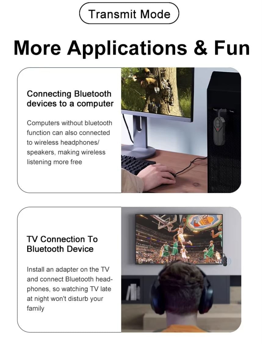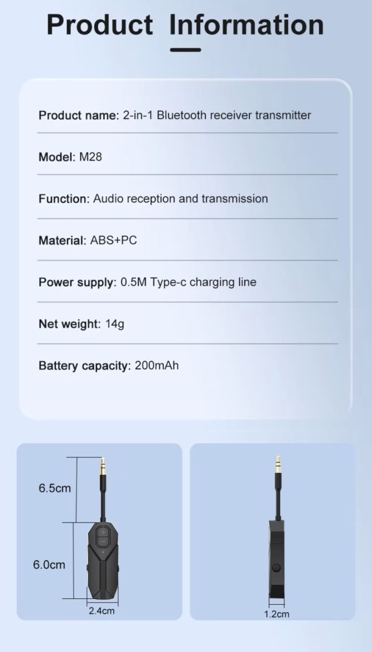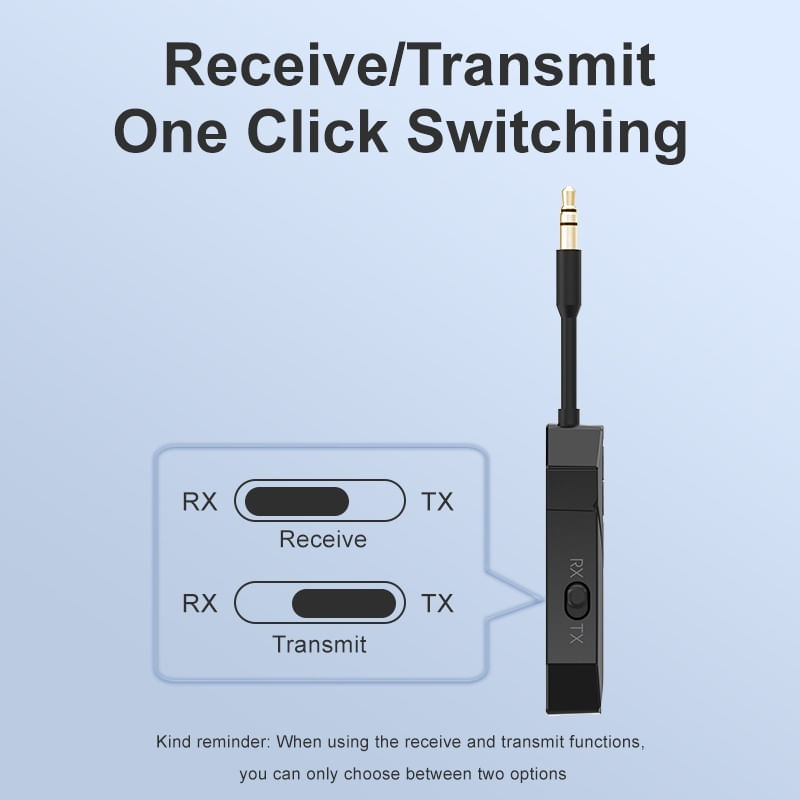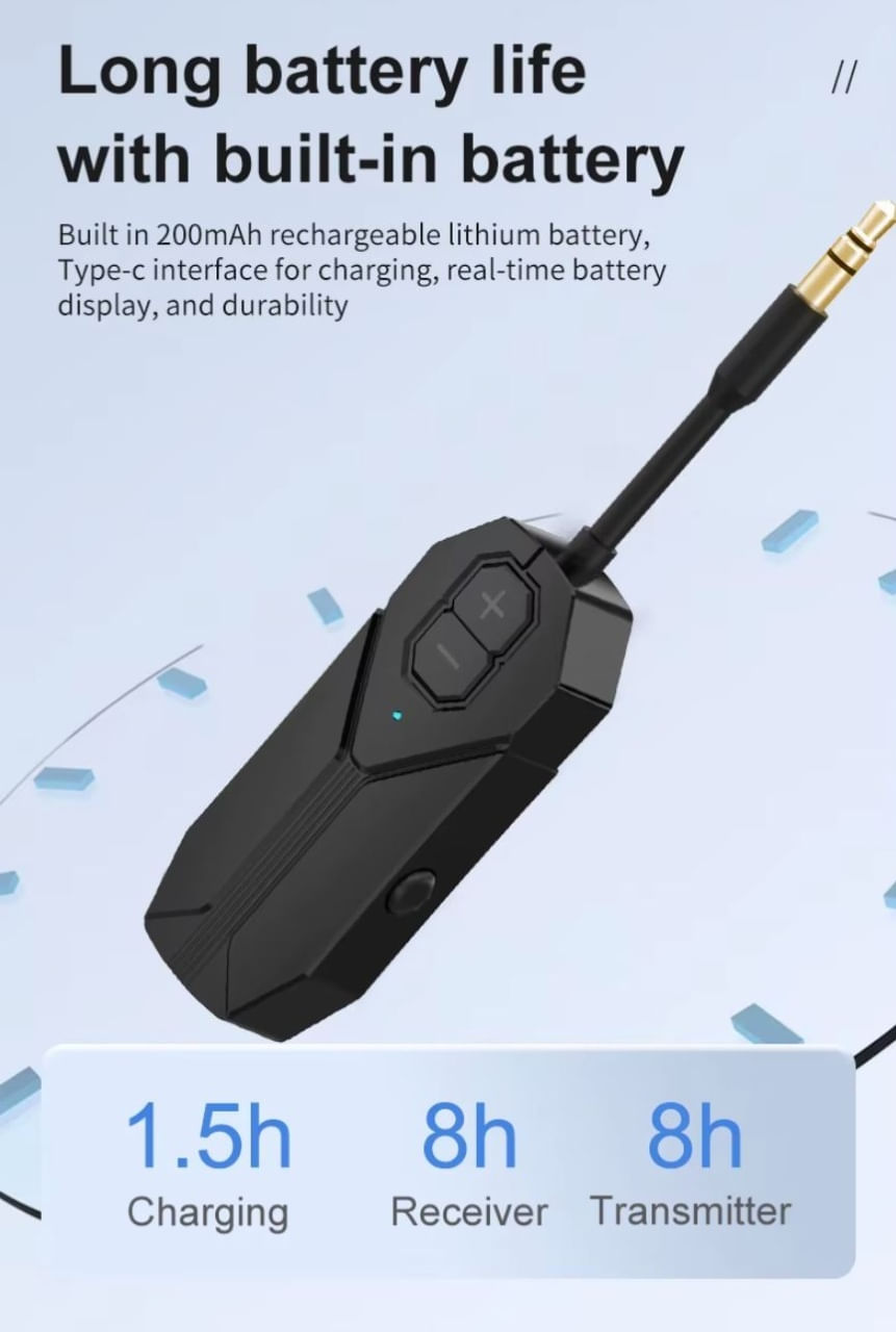Acest dispozitiv multifunctional poate fi utilizat atat ca transmitator (TX), cat si ca receptor (RX) audio Bluetooth, oferind conectivitate wireless pentru diverse echipamente audio. Este ideal pentru televizoare, sisteme audio, casti, smartphone-uri si tablete.Caracteristici principale:Functie dubla: Poate functiona atat ca transmitator, cat si ca receptor audio Bluetooth.Bluetooth 5.0: Asigura o conexiune rapida si stabila, cu o raza de actiune de pana la 10 metri.Compatibilitate extinsa: Conecteaza-te cu televizoare, PC-uri, sisteme audio, casti si alte dispozitive.Calitate audio superioara: Suporta transmisie audio clara si fara intreruperi.Baterie reincarcabila: Autonomie de pana la 8 ore de utilizare continua.Design compact si portabil: Usor de transportat si folosit in orice situatie.Beneficii:Conectivitate wireless: Transforma dispozitivele audio fara Bluetooth in dispozitive compatibile.Versatilitate maxima: Modul TX transmite sunetul, iar modul RX primeste semnal audio.Usor de folosit: Interfata simpla si butoane intuitive pentru comutare rapida intre moduri.Recomandari de utilizare:Modul TX: Conecteaza dispozitivul la sursa audio (TV, PC) prin cablu AUX si transmite sunetul catre casti sau boxe Bluetooth.Modul RX: Conecteaza-l la un sistem audio fara Bluetooth prin cablu AUX si primeste semnal audio de la smartphone sau tableta.Pachetul include:1 x Transmitator/Receptor audio Bluetooth 5.21 x Cablu AUX 3.5 mm1 x Cablu de incarcare USB1 x Manual de utilizareNota:Asigura-te ca dispozitivele cu care doresti sa-l folosesti sunt compatibile. Verifica specificatiile produsului inainte de achizitie.Acest transmitator si receptor audio Bluetooth 5.2 este solutia ideala pentru a adauga conectivitate wireless dispozitivelor tale audio, oferindu-ti flexibilitate si libertate in ascultarea muzicii preferate.