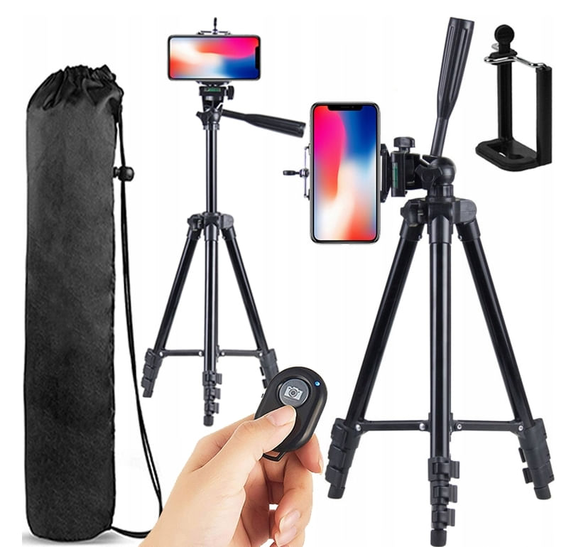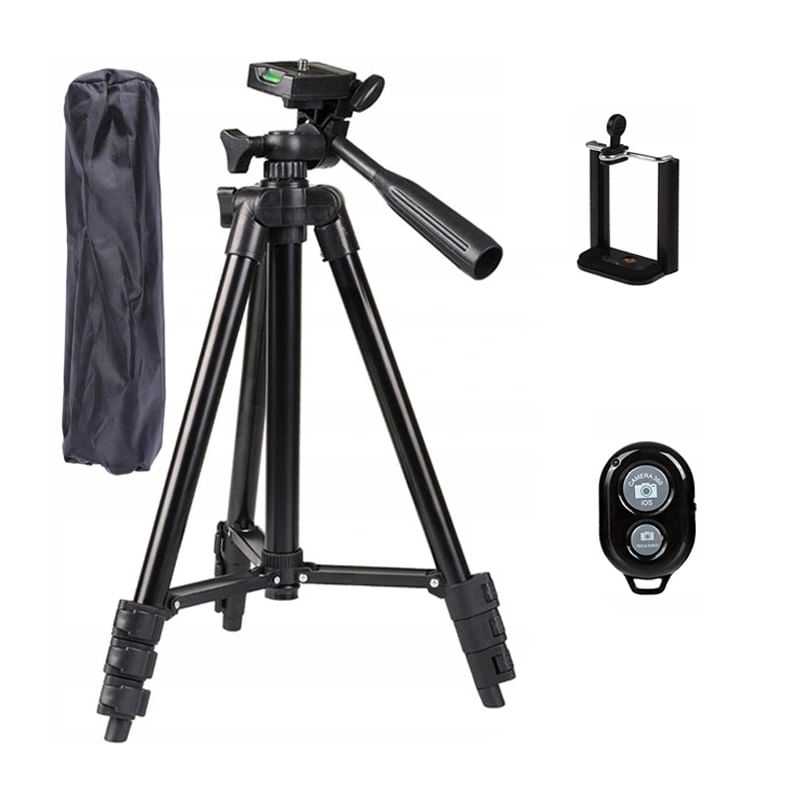 Un trepied extrem de usor, cu telecomanda si un suport pentru telefon cu picioare telescopice care poate fi extins independent, datorita caruia este extrem de usor sa reglati pozitia pe terenuri denivelate.